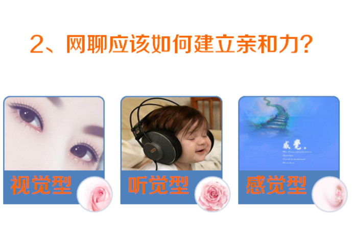 此外,由于互聯(lián)網(wǎng)交友的特殊性,很多人由于缺乏信任感會(huì)對(duì)本身的信息有所保存。這時(shí)候查戶口式的開口并不能夠幫我們了解對(duì)方,反而引起反感。盧艷霞老師體現(xiàn),人分為視覺型、聽覺型、感覺型。想要分清這三種人可以通過圖片、語音等形式進(jìn)行切換來表達(dá)本身的情緒,不雅觀察對(duì)方的反饋是否積極,從而找到與對(duì)方正確的聊天方式。