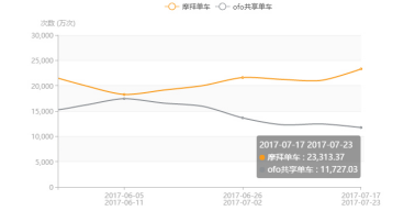 在APP周使用次數(shù)雙月走勢( 6 月 5 日至 11 日~ 7 月 17 日至 23 日)中,摩拜單車從 18269 萬次增長至 23313 萬次,增幅為28%,ofo小黃車從 17443 萬次下滑至 11727 萬次,降幅為33%。