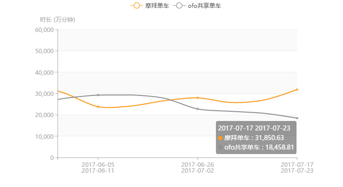 QuestMobile數(shù)據(jù)顯示,在APP周使用時長雙月走勢( 6 月 5 日至 11 日~ 7 月 17 日至 23 日)中,摩拜單車從 23819 萬分鐘增長至 31851 萬分鐘,增幅為34%,ofo小黃車從 29241 萬分鐘下滑至 18459 萬分鐘,降幅為37%。
