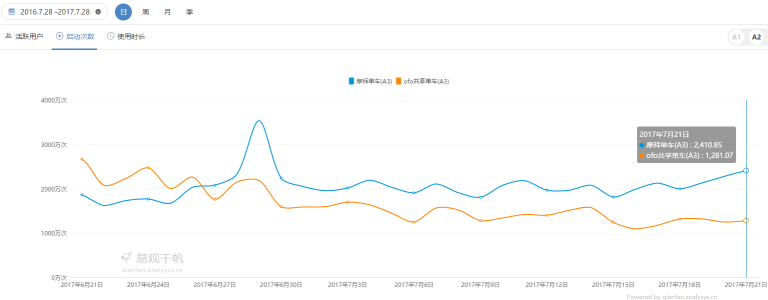 在APP日啟動次數(shù)單月走勢( 6 月 21 日~ 7 月 21 日)中,摩拜單車從 1863 萬增長至 2411 萬,增幅為29%,ofo小黃車從 2666 萬下滑至 1281 萬,降幅為52%。