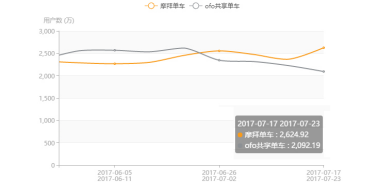 在周活躍用戶量雙月走勢( 6 月 5 日至 11 日~ 7 月 17 日至 23 日)中,摩拜單車從 2267 萬增長至 2625 萬,增幅為16%,ofo小黃車從 2568 萬下滑至 2092 萬,降幅為19%。