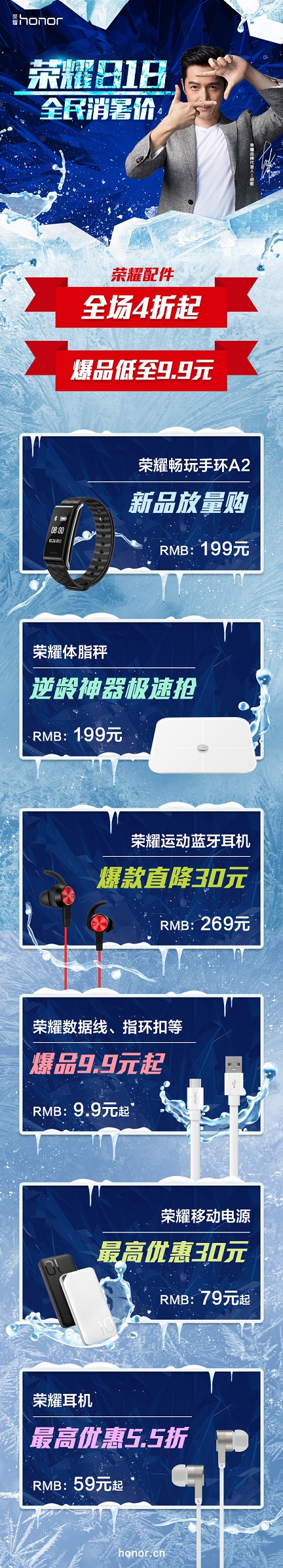 熱門配件優(yōu)惠全力助攻。不但各種機(jī)型優(yōu)惠多多,并且各種搶手的熱門配件也加入進(jìn)來強(qiáng)勢(shì)助攻,手機(jī)耳機(jī)、藍(lán)牙耳機(jī)、音箱、自拍桿、數(shù)據(jù)線、移動(dòng)電源、車充、智能穿戴等被大家所喜愛的配件都加入了促銷的行列,榮耀眾多配件也加入了優(yōu)惠的行列。榮耀配件全場(chǎng) 4 折起,爆品低至9. 9 元,榮耀穿戴產(chǎn)品最高直降 100 元,榮耀路由盒子最高直降 60 元成為了配件關(guān)注最熱單品……眾多熱門配件超值超誘人,總有一種打動(dòng)你。