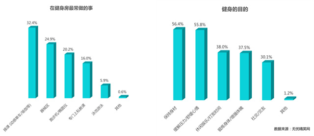 連結(jié)身材是精英健身的最大動(dòng)力,占比56.4%;有55.8%的健身是為了緩解壓力和舒緩表情,面對(duì)競(jìng)爭(zhēng)加劇的職場(chǎng),要連結(jié)健康的身材和良好的精神面貌,運(yùn)動(dòng)是最佳選擇,通過健身來辦理自身的良好職業(yè)形象成為共識(shí)。