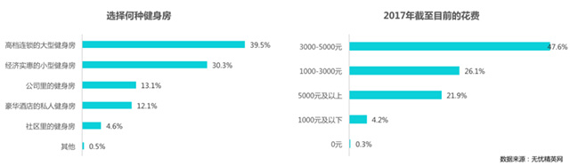 相對(duì)來說,健身房的花費(fèi)比其他運(yùn)動(dòng)方式高, 2017 年截至目前,在健身房的花費(fèi)最多的是3000- 5000 元,占47.6%,基本上是高檔連鎖型健身房一張年卡的價(jià)格。21.9%的花費(fèi)在 5000 元及以上,要么是豪華酒店的年卡,要么是請(qǐng)了私教。無憂精英網(wǎng) 7 月發(fā)布的《職場(chǎng)再學(xué)習(xí)調(diào)查陳訴》顯示,主力花費(fèi)為500- 1000 元,職場(chǎng)精英在身體上的投入遠(yuǎn)超過腦子上的投入,辦理身材和健康深入人心。