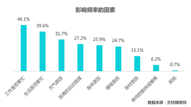 在影響去健身房頻率的原因調(diào)查中,近對(duì)折(46.1%)選擇工作太忙,好比加班到很晚沒時(shí)間。其次,生活繁忙(39.6%)如社交、吃飯、電影等,都會(huì)影響精英是否去健身。第三因素是天氣原因(37.1%),好比嚴(yán)寒、高溫、雷暴等。選擇單純懶惰的只占6.2%,很多時(shí)候工作生活繁忙、天氣欠好、距離太遠(yuǎn)、情緒不高等都是借口,即即是把跑步機(jī)買回家,也多數(shù)最后淪為“晾衣架”,看來要承認(rèn)本身懶惰是非常困難的。