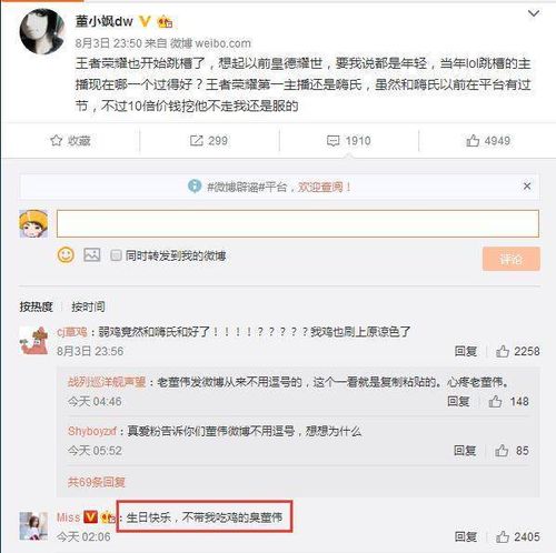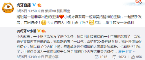 繼嗨氏還董小颯之后,張大仙更換平臺后的火爆首秀也迎來了虎牙平臺眾主播的集體“高潮”。如果說最開始的董小颯是虎牙官方授意發(fā)微博嘲諷的話,那后續(xù)各主播的所謂“表忠心”微博,便是虎牙內(nèi)部有計(jì)劃的蹭熱抹黑了吧。