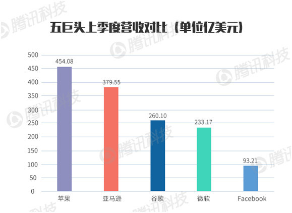 按照財(cái)報(bào)數(shù)據(jù)顯示,在該季度中五大科技巨頭的營(yíng)收均有不變?cè)鲩L(zhǎng),且勢(shì)頭良好。蘋(píng)果并沒(méi)有受到新款機(jī)型即將發(fā)布的影響,營(yíng)收比去年同期的423. 58 億美元增長(zhǎng)7%,依然具有領(lǐng)先優(yōu)勢(shì)。