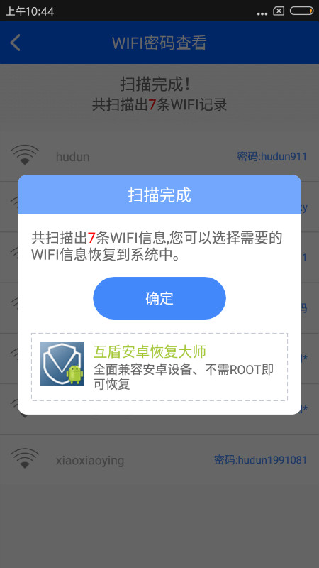 4.掃描結(jié)束后,軟件就會(huì)彈出掃描完成的提示框,我們不單可以預(yù)覽掃描的結(jié)果,點(diǎn)擊界面的“確定”按鈕,還可對(duì)具體的WiFi賬戶密碼進(jìn)行查看。