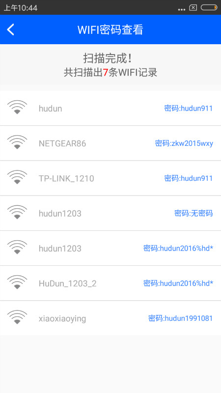 5.進(jìn)入WiFi密碼查看界面,就可以看見(jiàn)所有連接的WiFi賬戶及密碼,我們找到忘記的WiFi賬戶,就可查看相應(yīng)的WiFi密碼。