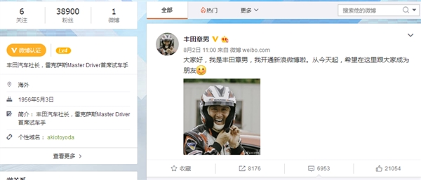 巨人網(wǎng)絡(luò)通訊聲明:本文標(biāo)題《豐田章男開通微博:成僅次于馬云的第二有錢大V》,本文關(guān)鍵詞 豐田,章男,開通,微博,成,;如發(fā)現(xiàn)本文內(nèi)容存在版權(quán)問題,煩請(qǐng)?zhí)峁┫嚓P(guān)信息告之我們,我們將及時(shí)溝通與處理。本站內(nèi)容系統(tǒng)采集于網(wǎng)絡(luò),涉及言論、版權(quán)與本站無關(guān)。