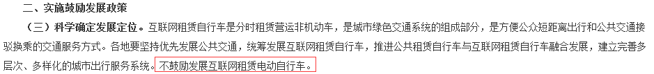 在昨日交通運(yùn)輸部、中央宣傳部、中央網(wǎng)信辦等十部門聯(lián)合印發(fā)的《關(guān)于鼓勵(lì)和規(guī)范互聯(lián)網(wǎng)租賃自行車發(fā)展的指導(dǎo)意見》中第三條明確指出,不鼓勵(lì)發(fā)展互聯(lián)網(wǎng)租賃電動(dòng)自行車。