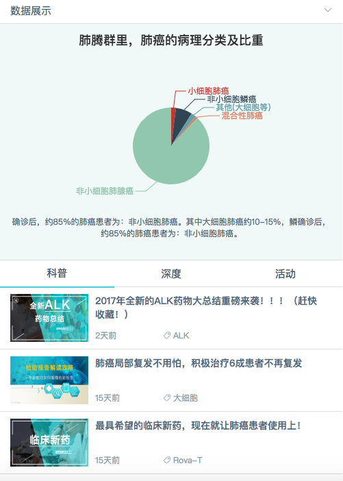 同時后臺標簽庫有著學習功能,可隨著大數(shù)據(jù)化的內(nèi)容完善,增加、細化標簽類別,讓文章分類更精準到達所需用戶面前,降低用戶獲取信息成本,極大提升信息對于疾病的科普有效性。加上每篇文章下討論區(qū)的設(shè)置,肺騰助手中的前沿科普功能一方面將帶來社區(qū)活躍度的提升,另一方面,也給用戶帶來醫(yī)療領(lǐng)域更多維的視角和思考。