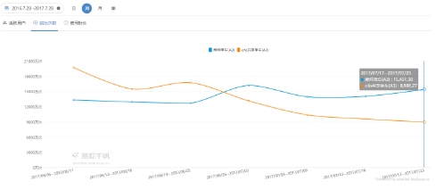 從APP啟動次數(shù)來看, 6 月 21 日到 7 月 21 日,摩拜APP日啟動次數(shù)從 1863 萬增長至 2411 萬,增幅為29%,ofo小黃車從 2666 萬下滑至 1281 萬,降幅為52%。 7 月 21 日,摩拜APP日啟動次數(shù)為 2411 萬,ofo小黃車為 1281 萬,摩拜領先88%。 6 月 5 日至 11 日~ 7 月 17 日至 23 日,摩拜APP周啟動次數(shù)雙月走勢從 13334 萬增長至 15431 萬,增幅為16%,ofo小黃車從 19763 萬下滑至 8986 萬,降幅為55%。第二季度,摩拜APP季度啟動次數(shù)為 238915 萬次,ofo小黃車為 168260 萬次,摩拜領先42%。