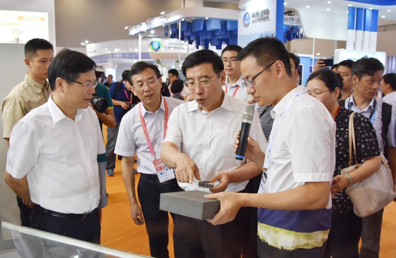 圖:北京隆源成型副總經(jīng)理牛志宇(右一)伴隨工業(yè)和信息化部部長苗圩(中)參不雅觀三帝科技展臺(tái)