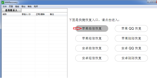 接下來(lái)就不需要手機(jī)了可以拔掉了,首先運(yùn)行恢復(fù)工具M(jìn)MRecovery,如下圖在右側(cè)快捷恢復(fù)入口,點(diǎn)擊 “蘋(píng)果微信恢復(fù) ”按鈕,將會(huì)彈出“微信恢復(fù)向?qū)А睂?duì)話(huà)框。