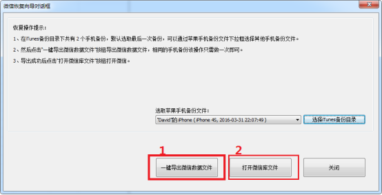 在“微信恢復(fù)向?qū)А睂?duì)話(huà)框中,如下圖點(diǎn)擊“一鍵導(dǎo)出微信數(shù)據(jù)文件”按鈕開(kāi)始導(dǎo)出微信數(shù)據(jù)文件,導(dǎo)出過(guò)程需要一點(diǎn)時(shí)間,完成后會(huì)提示成功信息。接下來(lái)點(diǎn)擊“打開(kāi)微信庫(kù)文件”按鈕,就能查看被雙擊的微信用戶(hù)的聊天記錄了。