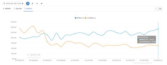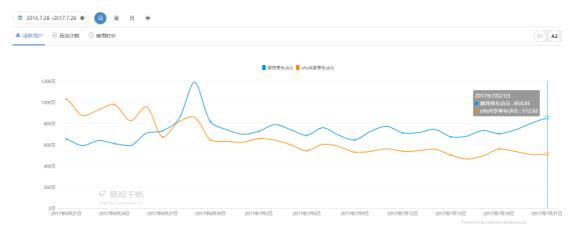 值得一提的是,APP啟動(dòng)次數(shù)也是共享單車辦事的重要指標(biāo)。易不雅觀千帆數(shù)據(jù)顯示, 6 月 21 日~ 7 月 21 日,摩拜單車APP的日啟動(dòng)次數(shù)從 1863 萬增長至 2411 萬,增幅為29%;ofo則從 2666 萬下滑至 1281 萬,降幅為52%。摩拜單車的領(lǐng)先幅度為88%。