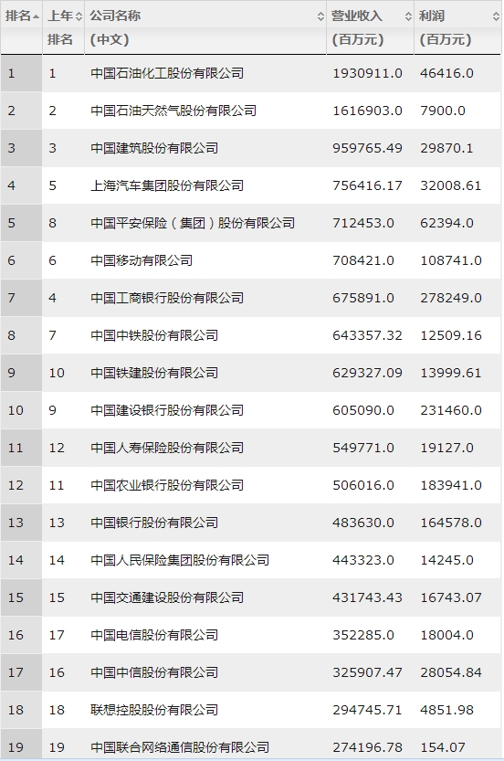 此次的前十名別離是中石化、中石油、中建、上汽、安然、移動、工行、中鐵、中鐵建和建行。