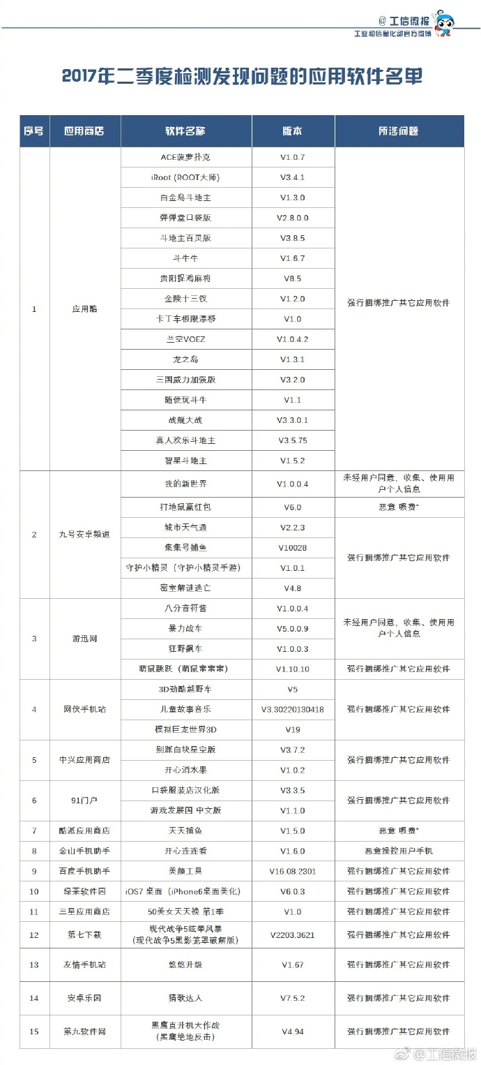 巨人網(wǎng)絡(luò)通訊聲明:本文標(biāo)題《工信部公布第二季度 APP黑名單:42款不良軟件被下架》,本文關(guān)鍵詞 工信部,公布,第二季度,;如發(fā)現(xiàn)本文內(nèi)容存在版權(quán)問(wèn)題,煩請(qǐng)?zhí)峁┫嚓P(guān)信息告之我們,我們將及時(shí)溝通與處理。本站內(nèi)容系統(tǒng)采集于網(wǎng)絡(luò),涉及言論、版權(quán)與本站無(wú)關(guān)。