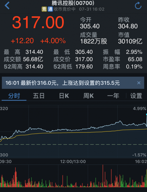 【TechWeb報道】 7 月 31 日消息,今日,騰訊控股開盤價305. 400 港元,盤中漲至 317 元,漲幅達(dá)4%,按此計算,,目前騰訊總市值已超過 3 萬億港元,這是繼本月 27 日后,騰訊股價再度急劇攀升。截止發(fā)稿前,騰訊控股股價報 314 港元,漲幅達(dá)3.02%。