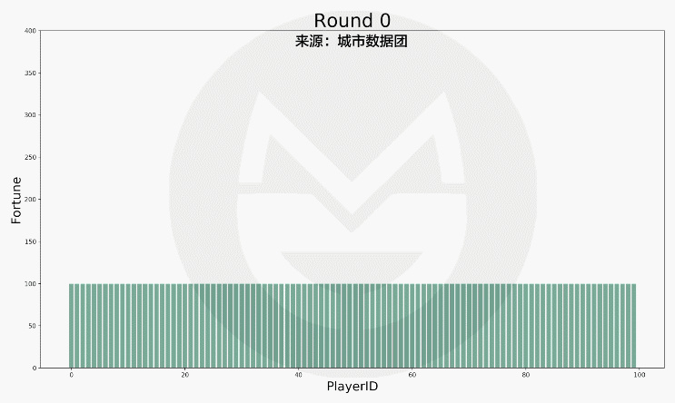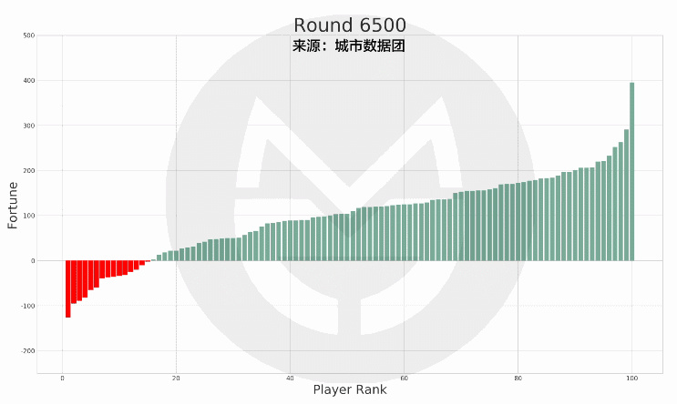 (說明:上圖中橫軸標簽代表玩家排序(非編號),排序越高的財富越多。初始時所有人的財富值相等,隨著游戲的進行,財富值差距越來越大。)