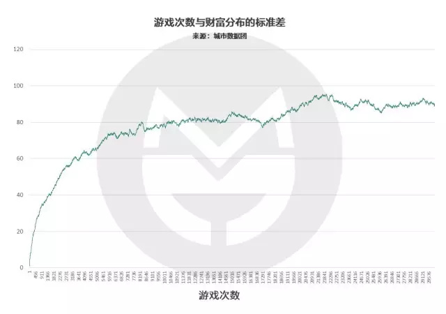 我們以所有玩家財富值的尺度差來衡量社會貧富分化程度,定時間序列做出圖來長這樣: