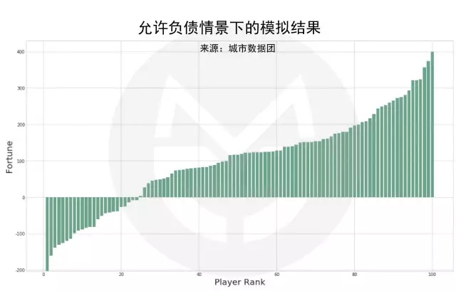 在現(xiàn)實社會中,情境會更復(fù)雜一些。好比說,當(dāng)我們沒錢了,還可以找親友、找銀行、找投資人借債,說不定哪天就東山再起了呢。在允許借債的情況下,游戲結(jié)果如下圖所示(排序后結(jié)果):