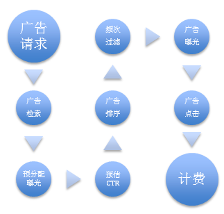 之所以大家都在追求點(diǎn)擊率,是因?yàn)榻^大多數(shù)信息流廣告平臺(tái)的產(chǎn)品機(jī)制是高度雷同的,在絕大多數(shù)的信息流廣告平臺(tái)上,信息流廣告往往會(huì)經(jīng)過預(yù)分配曝光、預(yù)估CTR、廣告排序和頻次過濾等幾個(gè)步驟后,展示在用戶面前: