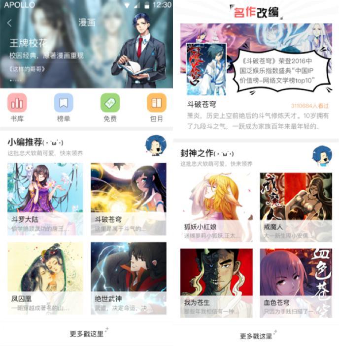 其中,新增的漫畫測試版塊是最值得一提的——源于二次元文化的盛行,漫畫儼然成為了IP代表版塊。既有《海賊王》《網(wǎng)球王子》等經(jīng)典大熱漫畫,也有《擇天記》《鬼吹燈》等由閱文集團(tuán)小說IP改編而成的漫畫。為了給予用戶最佳的體驗,QQ閱讀收錄了 2000 多部付費漫畫, 20000 多部免費漫畫。其中包孕了近 40 部由閱文集團(tuán)的原創(chuàng)文學(xué)IP改編的漫畫, 1000 多部正版日韓漫畫。