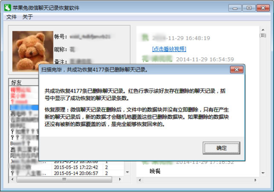 6,此時軟件界面上就可以查看該iPhone手機(jī)上與所有微信好友(含群聊)的微信聊天記錄了,到此,查看手機(jī)上的微信聊天記錄就告一段落了,但我們還有更重要的一步還沒有操作,那就是點擊下圖所示菜單,對微信上有意或無意刪除掉的信息進(jìn)行恢復(fù)。