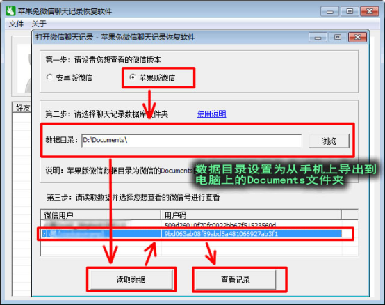 5,在電腦上下載并打開“蘋果兔微信聊天記錄恢復(fù)軟件”,然后按下圖所示步驟進(jìn)行操作,該軟件的內(nèi)部原理是直接解密讀取導(dǎo)出到電腦的Documents文件夾中的文件及信息。