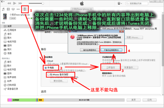 2,打開電腦上的iTunes軟件(請先下載安置),按下圖所示說明將iPhone手機(jī)上的所有文件都備份到電腦上。備份結(jié)束后,請將iTunes軟件關(guān)閉,并將iPhone手機(jī)從電腦USB口上移除。說明:iTunes并非微軟的Windows系統(tǒng)自帶的軟件,而是由喬布斯的蘋果公司提供的一款免費軟件,我們可以在百度上搜索并免費下載該軟件。