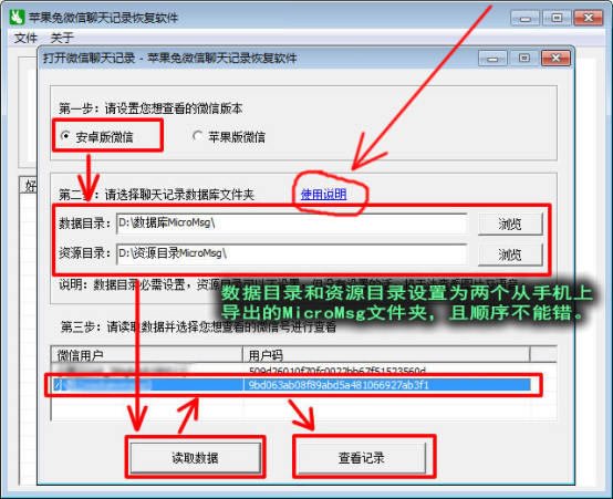 2、安卓手機(jī)微信聊天記錄刪除了怎么恢復(fù)查看因為篇幅的原因,在這里就不詳細(xì)說明安卓手機(jī)微信聊天記錄恢復(fù)的操作步驟了,但前文中提到的“蘋果兔微信聊天記錄恢復(fù)軟件”,是同樣支持安卓手機(jī)的。“蘋果兔”只是該軟件的標(biāo)識詞,并不代表該軟件只支持蘋果手機(jī),我們可以下載并打開該軟件后,點擊下圖中部的“使用說明”鏈接,然后在蘋果兔軟件的官網(wǎng)上了解具體的操作指南。