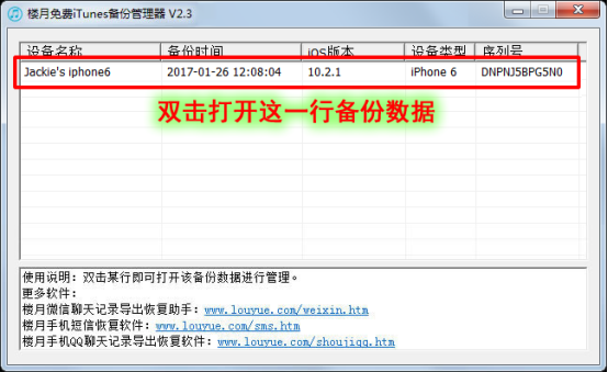 3,接著在電腦上打開一款名為“樓月免費iTunes備份辦理器”的小軟件,雙擊打開主窗口上看到的那一行備份數(shù)據(jù)(如下圖紅框所示)。說明:該軟件是由一家小公司所開發(fā)的一款免費軟件,我們可以在任意下載站免費下載到該軟件,也可直接在百度上搜索下載到。