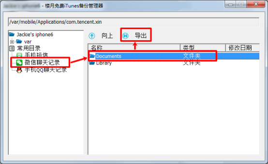 4,在彈出的子窗口上,點擊左邊的“微信聊天記錄”項,然后把右邊的Documents文件夾導(dǎo)出到電腦上的任意目錄下。