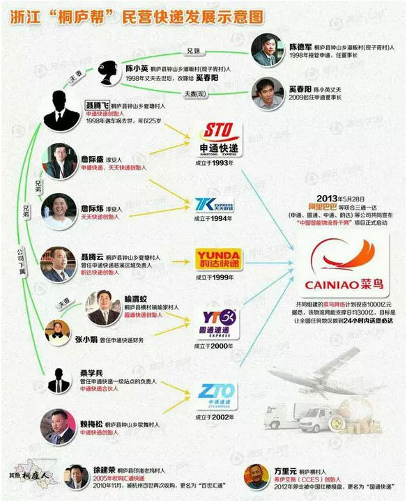 盛傳頗廣的故事是,聶騰飛、詹際盛在 1993 年雙雙從工廠辭工,創(chuàng)辦了后來(lái)的“申通快遞”,成為國(guó)內(nèi)第一家民營(yíng)特許加盟的快遞企業(yè)。風(fēng)云際會(huì),滄海橫流,在復(fù)雜的人際關(guān)系和創(chuàng)業(yè)出走的浪潮中,申通、圓通、韻達(dá)、中通、匯通、天天快遞,以及已經(jīng)更名為國(guó)通的CCES,背后都不乏桐廬籍企業(yè)家的身影,桐廬幫占領(lǐng)了中國(guó)快遞業(yè)的豆剖瓜分。