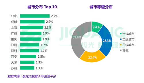 城市分布數(shù)據(jù)顯示,有37.7%的抖音用戶居住在一二線城市。在具體城市分布上,北京的占比最高,為2.7%。排名第二和第三的城市別離為成都和上海,別離占2.2%和2.1%。