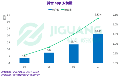 近日,極光大數(shù)據(jù)發(fā)布了《 2017 年度Q2 app榜單》。陳訴顯示,短視頻應(yīng)用“抖音”在 2017 年Q2 首次進入滲透率Top300 清單,排在第 223 位,其市場滲透率達到1.5%。而在短視頻領(lǐng)域則排名第4,僅在快手、美拍和西瓜視頻之后。