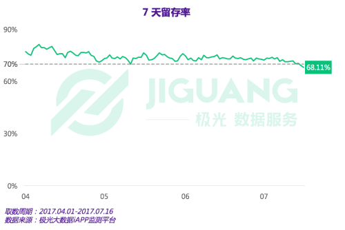 在本月,抖音短視頻的日新增用戶數(shù)也突破了 40 萬關(guān)口。與此同時,我們發(fā)現(xiàn)抖音的 7 天留存率大多連結(jié)在70%以上。這說明了抖音能較好地滿足用戶的使用需求,大多數(shù)用戶在嘗鮮期過后依然會選擇保存應(yīng)用。