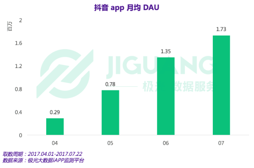 我們在日均DAU(日活躍用戶)上也看到了類似的趨勢。極光大數(shù)據(jù)顯示,抖音短視頻的日均DAU在Q2 開始迅速攀升,且在 6 月份突破百萬大關(guān)。在本年 7 月份(數(shù)據(jù)截至 7 月 22 日),該款應(yīng)用的月均DAU數(shù)值已經(jīng)達到 173 萬。