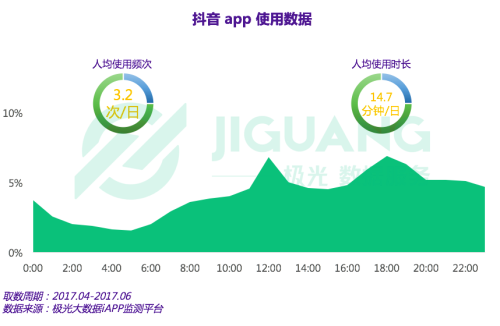 按照Q2 的使用數(shù)據(jù),抖音的人均使用次數(shù)為3. 2 次/日,每日人均使用時長14. 7 分鐘。用戶的使用高峰時段集中在中午 12 點和晚上 6 點前后。