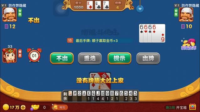 知道地主有炸的情況下要學會防炸,最好的方法是盡量把牌走干凈,然后在隊友的庇護下,地主即使炸掉也回天無力了。本身本地主時也要防農(nóng)民有炸。