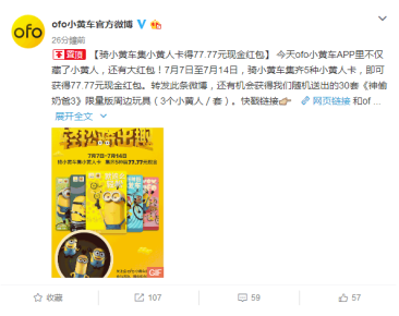 ofo小黃車推出了紅包車福利,用戶在指定區(qū)域騎行超過(guò)指按時(shí)間,就可以隨機(jī)獲得小黃車發(fā)的紅包。在ofo與小黃人合作后,紅包車玩法再升級(jí),騎小黃車集齊5種小黃人卡,就可獲得77.77元現(xiàn)金紅包,轉(zhuǎn)發(fā)微博還有機(jī)會(huì)贏取《神偷奶爸3》限量版周邊玩具。