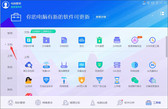 騰訊電腦管家12. 7 版本推出的文檔掩護(hù)八大工具,貫穿用戶文檔使用的全過(guò)程,滿足了用戶對(duì)備份文檔、抵御病毒攻擊、恢復(fù)文檔和清除垃圾文件的多種需求。通過(guò)八大工具的配合使用,用戶可以在各種文檔問(wèn)題中找到相應(yīng)的解決方案,給予電腦文檔最有利的安適保障。