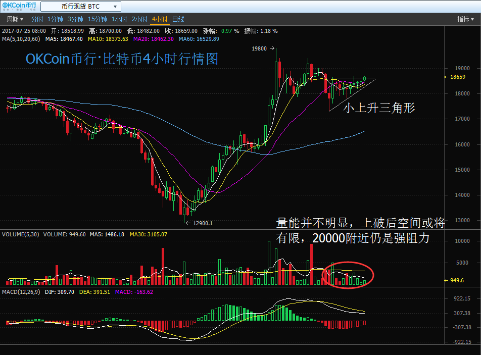 按照國內(nèi)知名的數(shù)字資產(chǎn)交易平臺(tái)OKCoin幣行的數(shù)據(jù)顯示,比特幣昨天( 7 月 24 日)價(jià)格繼續(xù)高位震蕩,振幅比擬前一交易日明顯收窄,交易時(shí)段內(nèi)主要圍繞17800— 18710 窄幅顛簸,依舊未能選擇標(biāo)的目的。截止今日發(fā)稿前,價(jià)格處于盤整區(qū)高位運(yùn)行,最新交投于 18640 附近。