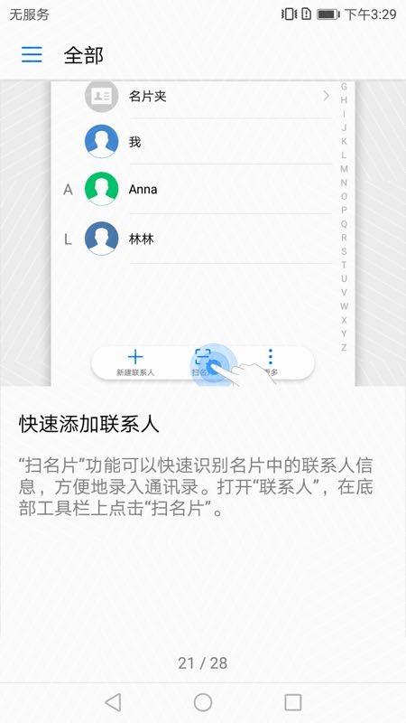 職場打拼,靠個人努力努力再努力,也少不得公司表里工作伙伴的鼎力相助,兩人初識交換名片是職場慣例,一張小小的名片包羅了對方姓名、聯(lián)系方式、所屬公司、職務(wù)稱謂等諸多重要信息,保存、翻找名片十分費力,一不小心丟失還可能錯過諸多合作機會,可是如此龐雜的信息錄入手機也真是讓人耗時又煩躁。華為nova2 系列“掃名片”功能一招幫你解決懊惱,,打開“聯(lián)系人”,在底部工具欄上點擊“掃名片”,對準名片掃描即可快速識別號片中的聯(lián)系人信息,便利錄入聯(lián)系人。要做叱咤風(fēng)云的職場達人,帶上nova2 打造本身的黃金人脈吧。
