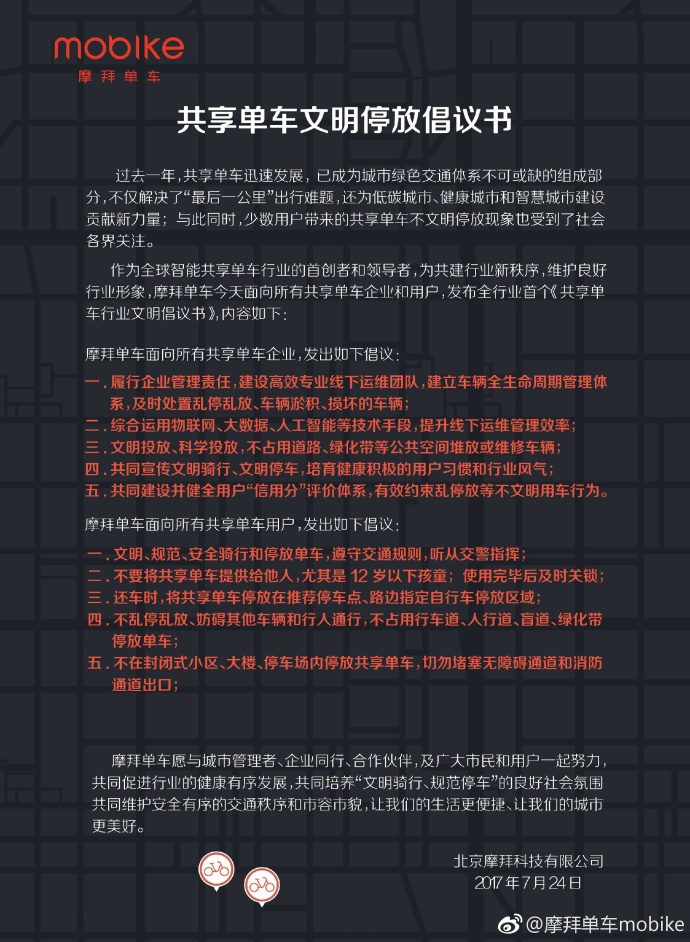 摩拜單車(chē)相關(guān)負(fù)責(zé)人士體現(xiàn),發(fā)布的行業(yè)首個(gè)《共享單車(chē)文明停放倡議書(shū)》,是摩拜單車(chē)倡導(dǎo)文明騎行、文明停放的最新舉措?!跋Mㄟ^(guò)《倡議書(shū)》繼續(xù)鞭策共享單車(chē)行業(yè)的健康有序發(fā)展,讓城市生活更美好。