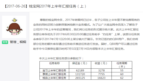 隨著國家對金融秩序的嚴格監(jiān)管, 錢寶網(wǎng)于 2017 年 6 月做了大規(guī)模改版,很多頁面內(nèi)容已經(jīng)不容易找到。以下是網(wǎng)友提供的一些錢寶網(wǎng)用戶獲得的公證資料。