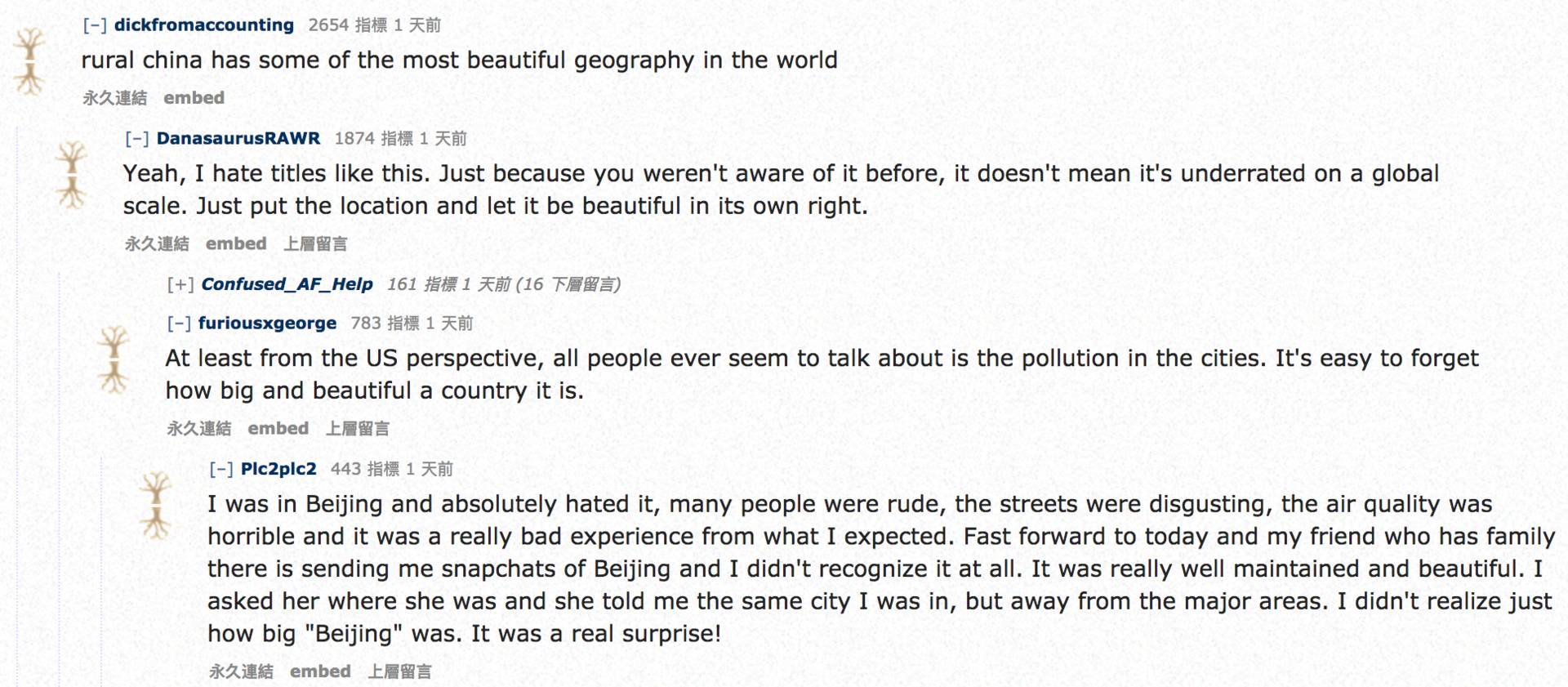 網(wǎng)友的討論包羅了中國的美景、中國國土面積之大、中國的城市污染問題、西方媒體對中國的片面報道、甚至中國人吃狗肉這件事。幾乎在每個話題上,都有人針鋒相對。好比就中國人吃狗肉這個問題,有人覺得不成接受,有人覺得這和美國人吃豬肉沒啥兩樣。
