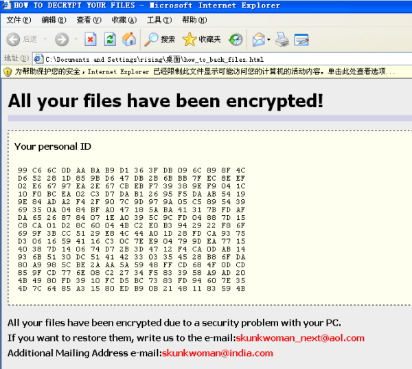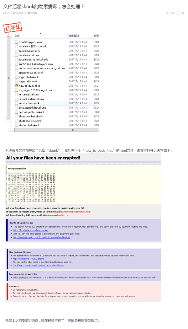 2017 年 7 月 19 日,國內網友在安適論壇上反饋,本身的辦事器中了勒索病毒,所有的文件均被加密,文件后綴名被修改為“skunk”。經瑞星安適專家調查分析發(fā)現(xiàn)是感染了Ransom.Globelmoster勒索病毒。